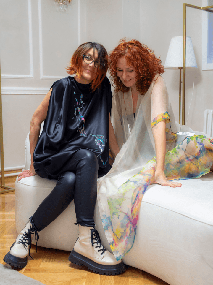 Jelena, Tatjana: Obe slikamo na svili i u jednom momentu smo shvatile da bi se tim slikama na svili mogla dati nova vrsta interpretacije, kao i primene. Slike postaju skulpture, odnosno slike na odevnim predmetima i tako se na neki način transformišu i uvlače u svakodnevnicu. Iz takve interpretacije, stvorile smo i mali brend DoubleTrouble uz koji pokušavamo da unesemo dodir umetnosti u svakodnevnicu, kreirajući bezvremensku, ručno slikanu unikatnu svilenu odeću za ljubitelje umetnosti, a uz potpuno različite poetike slikanja.