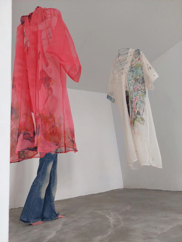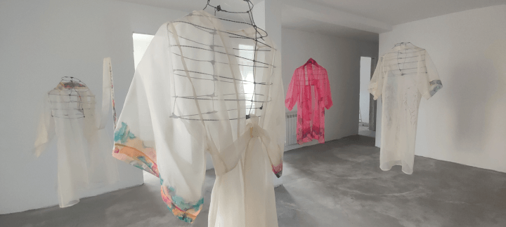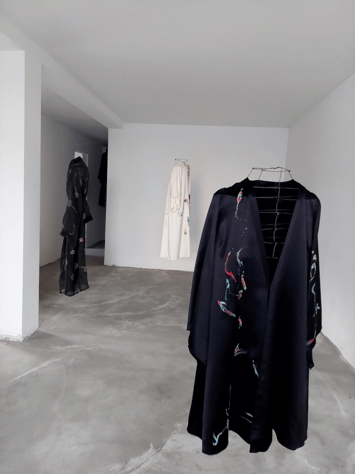 Jelena, Tatjana: Slike na svili, instalacije ili oslikani odevni predmeti, u zavisnosti od načina na koji su izloženi, mogu da se okarakterišu kao ambijentalna postavka. Ako je u pitanju odevni predmet, on postaje skulptura. Ta oslikana skulptura može biti i nosiva u svakodnevnom životu. Možete je dodirnuti, osetiti, čuti ako prođete dovoljno blizu nje, a posmatranjem iz različitih uglova je vidite i doživite na potpuno drugačiji način.