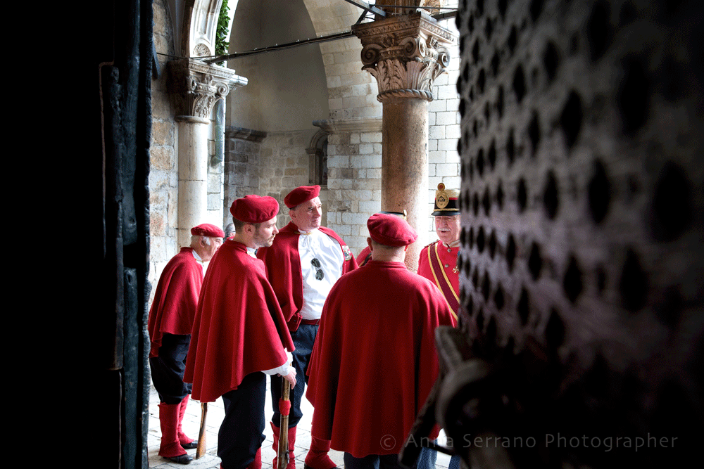 Ci sono i “festanjuli”, i notabili della città, questi signori di età venerabile, eleganti, educati, sorridenti e silenziosi, vestiti in loden nero e cappello. Ci sono le ragazze in costume locale, la banda, gli sbandieratori, tutti coinvolti con fervore nelle varie manifestazioni: l’imposizione delle candele intrecciate, la processione fino all’eremo, la sfilata delle reliquie del Santo lungo lo Stradun (la strada principale), baciate e toccate dai fedeli, e perfino l’esibizione di un baldacchino con l‘urna contenente degli improbabili „pannolini di Gesù Cristo“… Per la gente di Dubrovnik, San Biagio è la festa per eccellenza, quella più importante dell’anno, più grande di Natale, Capodanno o Pasqua.