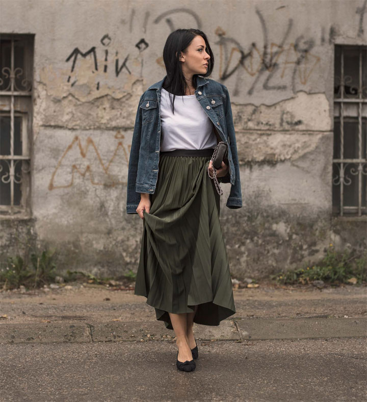 Maslinasto zelena – suknja u kombinaciji sa belom majicom i teksas suknjom.