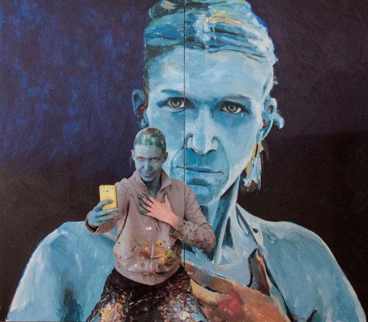 IVONA PLESKONJA NA IZLOŽBI DOČEKUJE LJUBITELJE UMETNOSTI AUTOPORTRETOM KOJIM PREDSTAVLJA SEBE U TRENUTKU PREKRETNICE U SVOM ŽIVOTU 2015. GODINE. STOJI USPRAVNO PRIHVATAJUĆI ISTINU I DOŽIVLJAVA PREOBRAŽAJ.