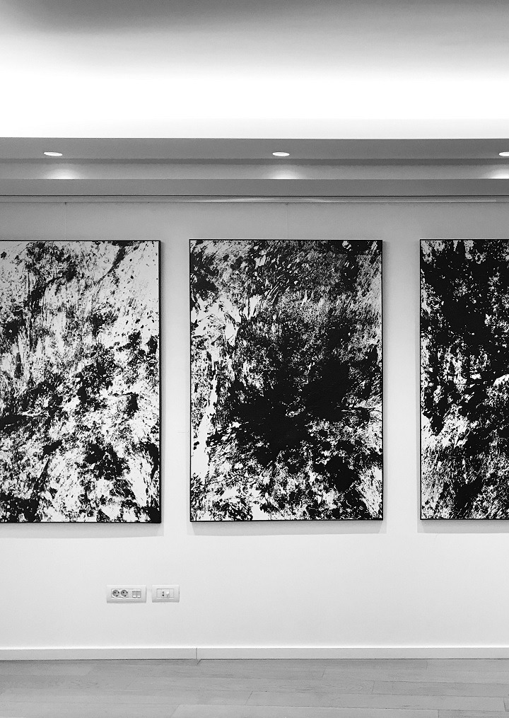 “The work of Milan Markovic is one of inherent conflict. His concern with the relationship, both spiritual and physical, between black and white create a palpable encounter on each of the canvases he paints. Using the technique of drip-painting, it is as though his paintings have a life of their own, allowing for the black or white paint to progress, submerge, or retract, when coming into contact with one another. The result leaves the viewer with intricate and complex cartography of this duel, where this otherwise binary association of colours comes together as one. Each composition is of pure abstraction, and yet Markovic creates a multitude of narratives and interpretations which are visceral and deeply rooted in the historical understanding of light and dark, black and white.”