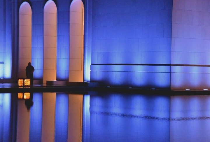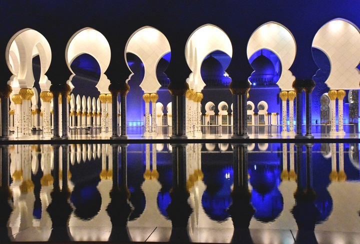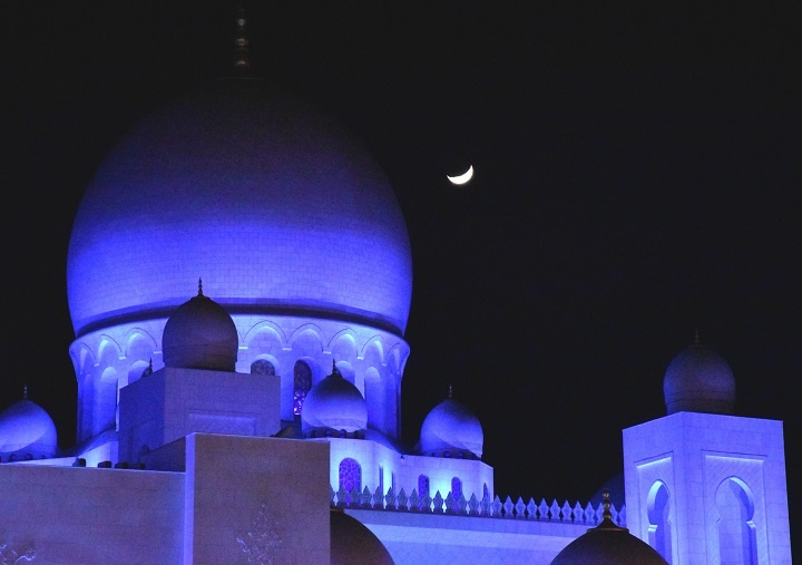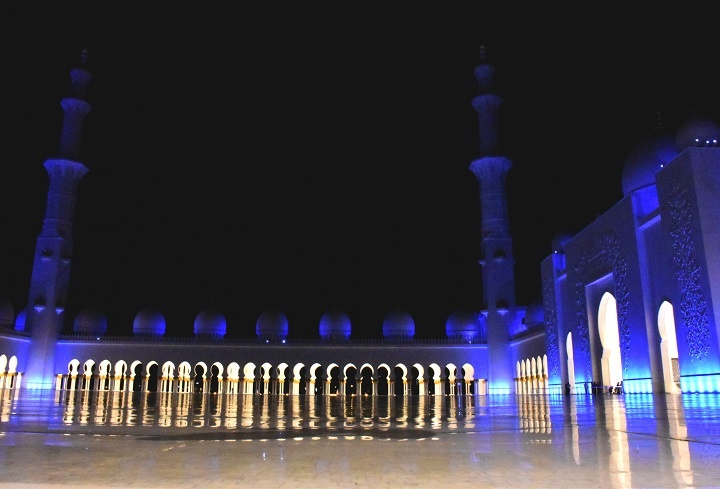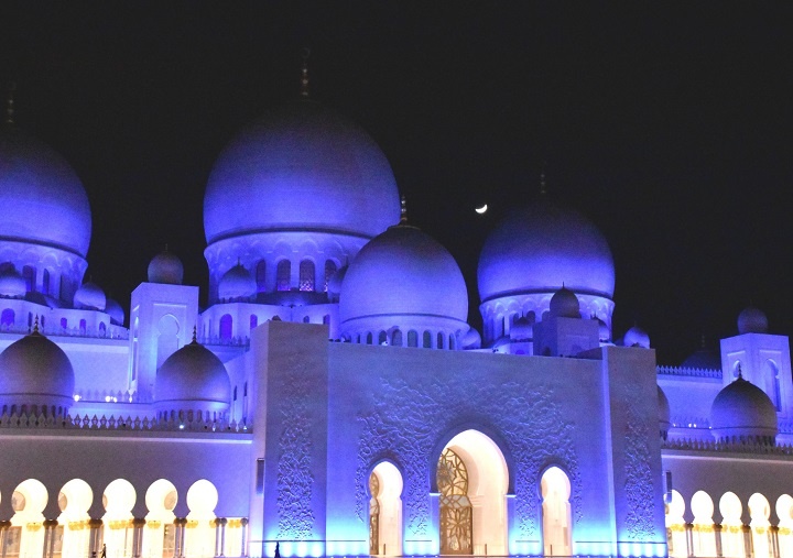 Tokom noći, dok je mlad mesec bio nad Abu Dabijem, džamija je svetlela tamnoplavom bojom. Bila je to igra svetolosti i tame i odsjaja mesečine.
