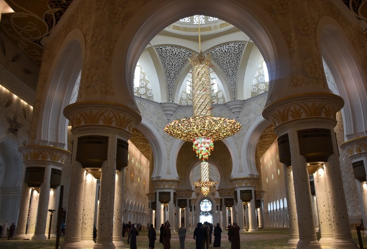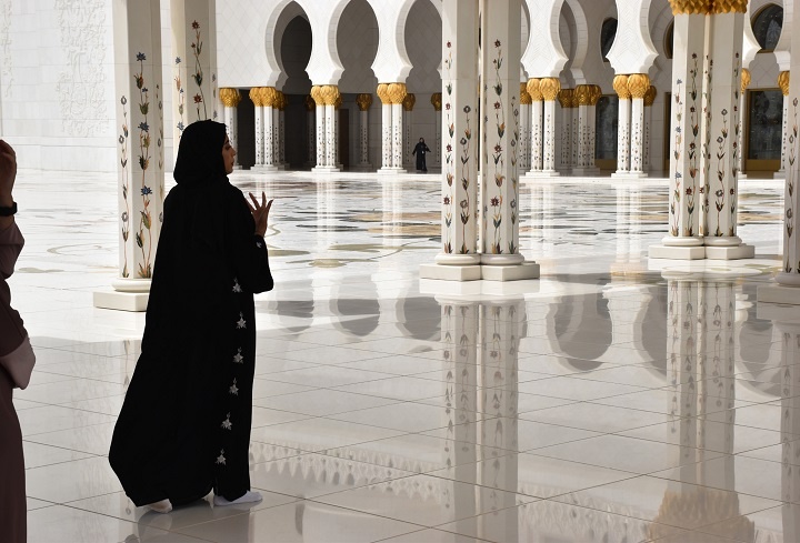 Tokom mog desetodnevnog boravka u Abu Dabiju, džamiju sam obišla dva puta. Prvi put tokom dana dok se sunce odbijalo o beličasti mermer i dok su posetioci, bez obzira na nacionalnost i veorispovest, ulazili u džamiju po tačno utvrđenom kodesku oblačenja. Odeća mora biti široka i dugih rukava i nogavica. Svaka žena može ući u džamiju tek kada pokrije kosu maramom i ogrne se ogrtačem, odnosno abajom. Ulazi se bosih nogu, a cipele se ostavljaju na samom ulazu u numerisanim policama.