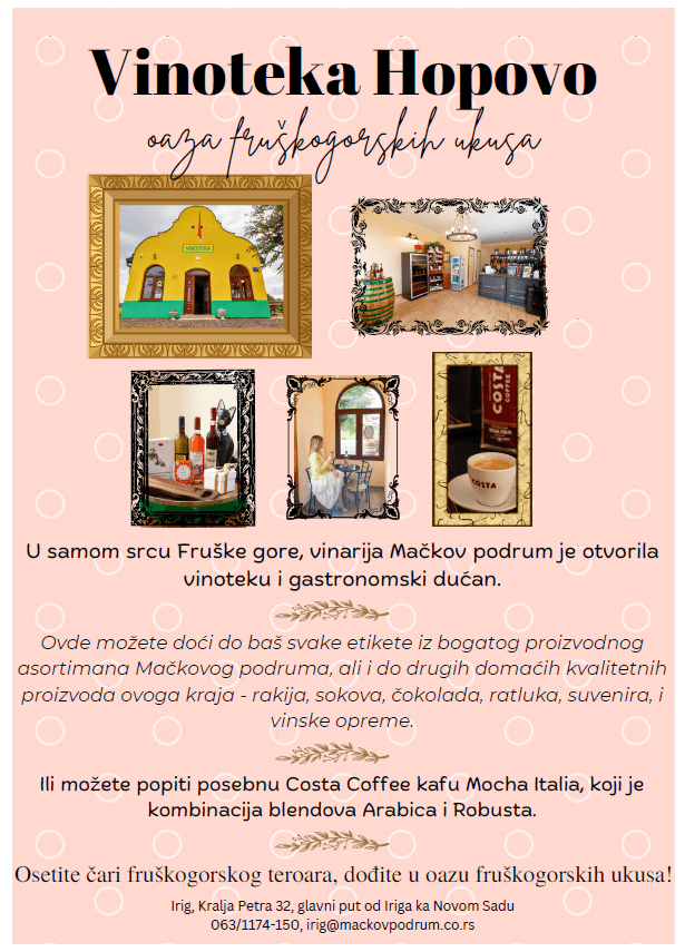 U maju ste otvorili vinoteku i gastro dućan Hopovo, u kojem će se prodavati sva vina iz Mačkovog podruma, ali i drugi proizvodi nastali na Fruškoj Gori i okolini.