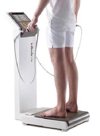 Slika 2: Prikaz merenja telesne strukture bioelektričnom impedancom (slika levo).