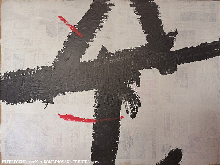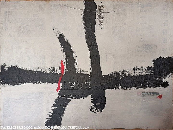 A kako drugačije? (smeh) Bude tu i manjih formata i nežnijeg izraza, svi smo mi i Džekili i Hajdovi, ali veliki format trpi fiziku. Zamah, razmah. U veliki format može da se “uđe” celim telom, celim bićem. Mislim da i sam posmatrač suočen sa dimenzijom dela podešava svoju svest. Nije svejedno da li je nešto veće ili manje od “tebe”. I, da… nisu to četkice, to su pre četketine, neke od njih imaju i svoja imena (smeh) ne šalim se…