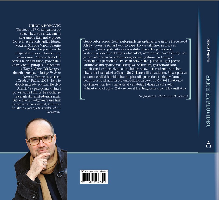NIKOLA POPOVIĆ (SARAJEVO, 1979), ITALIJANISTA I PISAC, AUTOR JE KNJIGA PUTOPISNE PROZE „PRIČA IZ LIBANA“ (CENTAR ZA KULTURU „GRADAC“, RAŠKA, 2016) I „SKICE ZA PLOVIDBU“ (BEOGRAD, AGNOSTA, 2019). U KNJIZI „SKICE ZA PLOVIDBU“, ČIJA JE PROMOCIJA ODRŽANA 13. DECEMBRA 2019. U NARODNOJ BIBLIOTECI SRBIJE, GOVORILO SE O DOŽIVLJENOM I SNEVANOM U PUTOPISU, O SAMOSVOJNIM ŽIVOTIMA I RITMU PUTOVANJA, TE MUZICI, GASTRONOMIJI, SVETU PRIRODE KOJI PRATI PRIČE. PUTOPISI OBUHVATAJU ŠIROK PROSTOR – OD AFRIKE, SEVERNE AMERIKE DO EVROPE. NA SVAKOM MERIDIJANU DILJEM ZEMLJINOG ŠARA, AUTOR OŽIVLJAVA KULTUROLOŠKE I PRIRODNE ASPEKTE PROSTORA – UŽARENI AFRIČKI PESAK, BRZI RITAM BUBNJEVA I VATRENO NEBO U TOGOU, GANI, KONGU, OKEANSKE PLAŽE I TIRKIZNO NEBO U KALIFORNIJI, VRELI RITAM DŽEZA I LJUTA, ZAČINJENA HRANA I SOSOVI U AMERIČKIM GRADOVIMA NJU ORLEANSU I BAFALU, MEDITERANSKE LUKE U LIBANU, ALPSKE VAROŠICE, SNEŽNI PREVOJI I VRHOVI. AUTOR OPISUJE ISTORIJU, MUZIKU, PEJZAŽ, ALI POSMATRAJUĆI I DOŽIVLJAVAJUĆI AMBIJENT, USMEREN JE UVEK NA POJEDINCA, JEDINSTVENE SUDBINE I PLOVIDBU KROZ ŽIVOT.