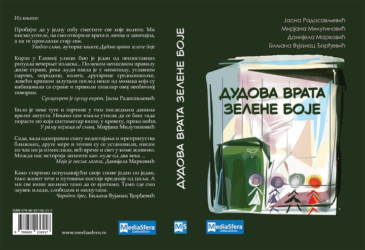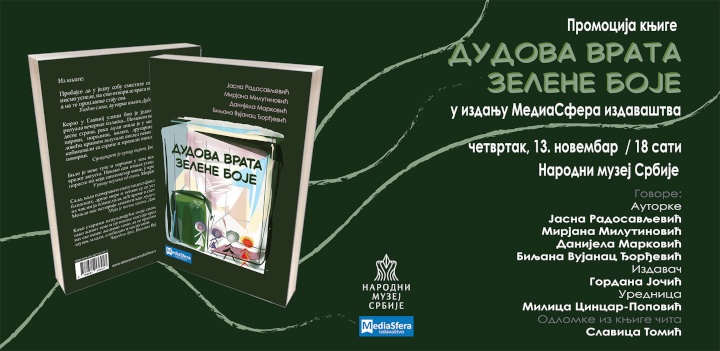 Промоција књиге “Дудова врата зелене боје” ауторки Јасне Радосављевић, Мирјане Милутиновић, Данијеле Марковић и Биљане Вујанац Ђорђевић одржаће у четвртак, 13. новембара од 18 часова у Народном музеју Србије. Поред ауторки на промоцији ће говорити Милица Цинцар-Поповић, уредница и Гордана Јочић, издавч. Одломке из књиге чита Славица Томић.