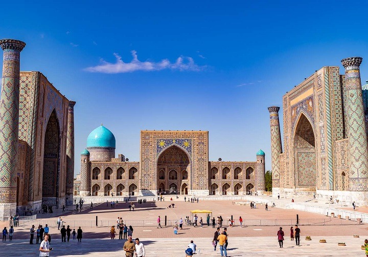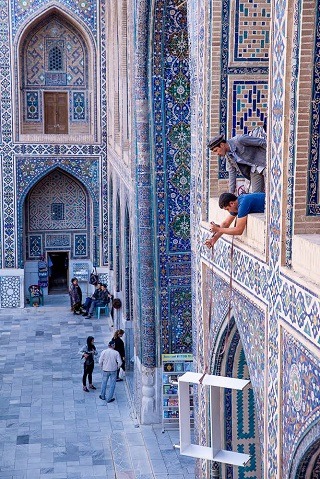 I tako omađijan i zbunjen od istočnjačkog nadmudrivanja, sa večitim pitanjem da li si dobro prošao, odletiš na tom istom šarenom ćilimu i zastaneš, baš tu na sred Registana, glavnog trga drevnog Samarkanda. Okrepiš se u prizoru iz 1001 noći. Tri prekrasne medrese stoje u polukrugu jedna pored druge, a najpoznatija i najlepša astronoma Ulugbega, gde su se budući naraštaji učili astronomiji, filozofiji, teologiji.